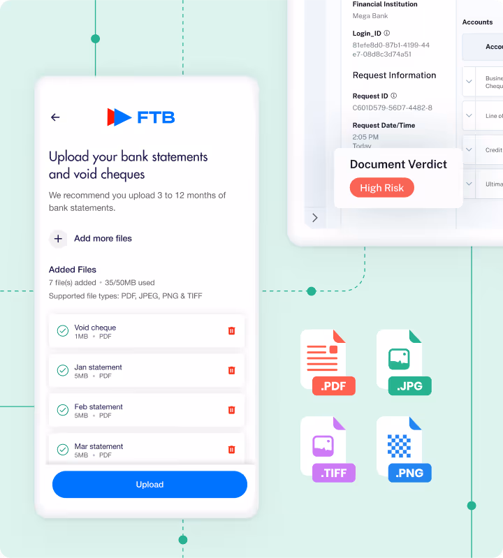 Plug in aggregated bank data via Flinks Connect, verified documents through Flinks Upload, or CSV and JSON files with raw data from external providers like Plaid.
