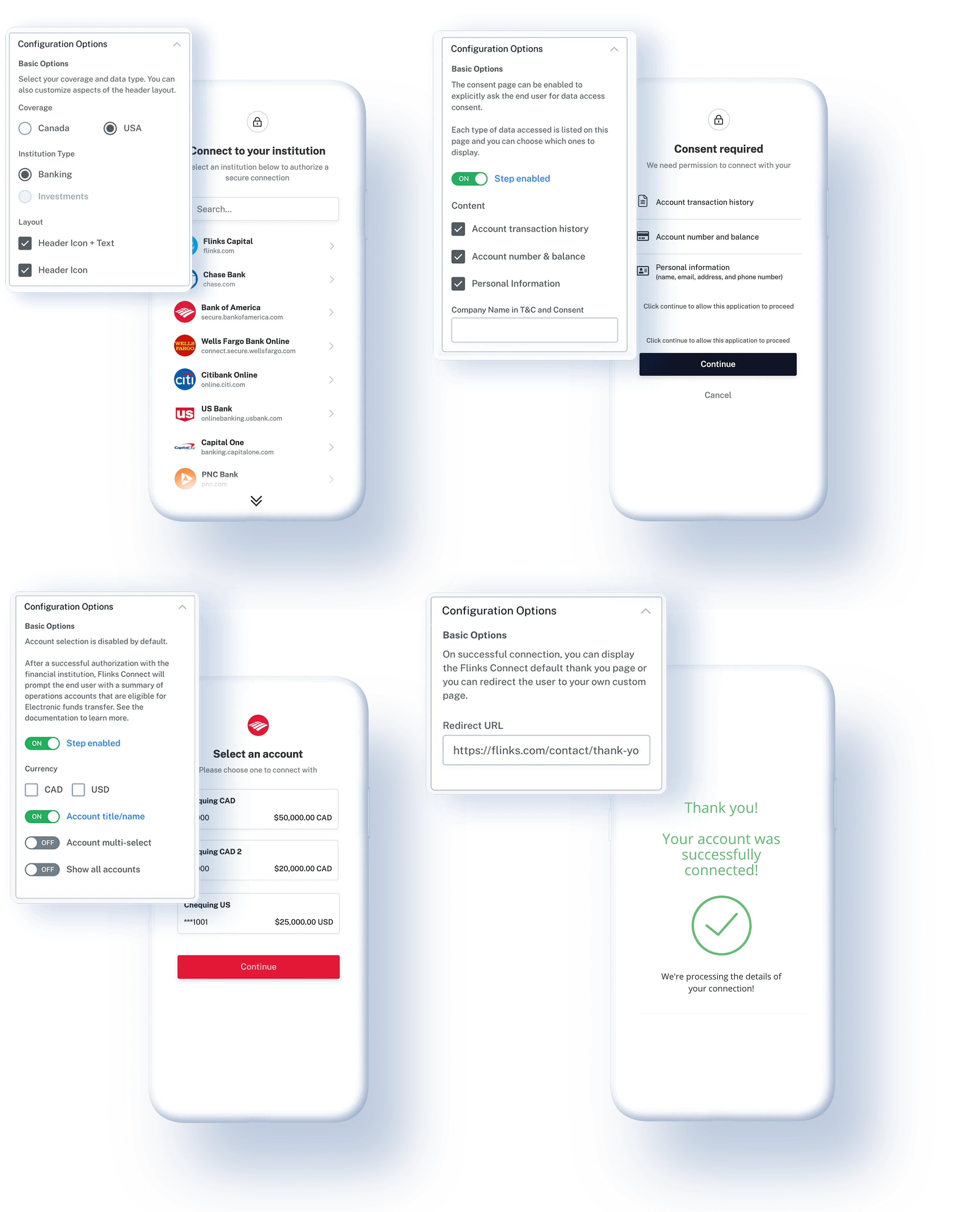 Dashboard users can adapt the customer authentication experience to your brand (logos and colors) and your workflow (custom banner, texts, and optional forms) using Flinks Connect Configurator. No UI/UX design or implementation resources are needed on your end.