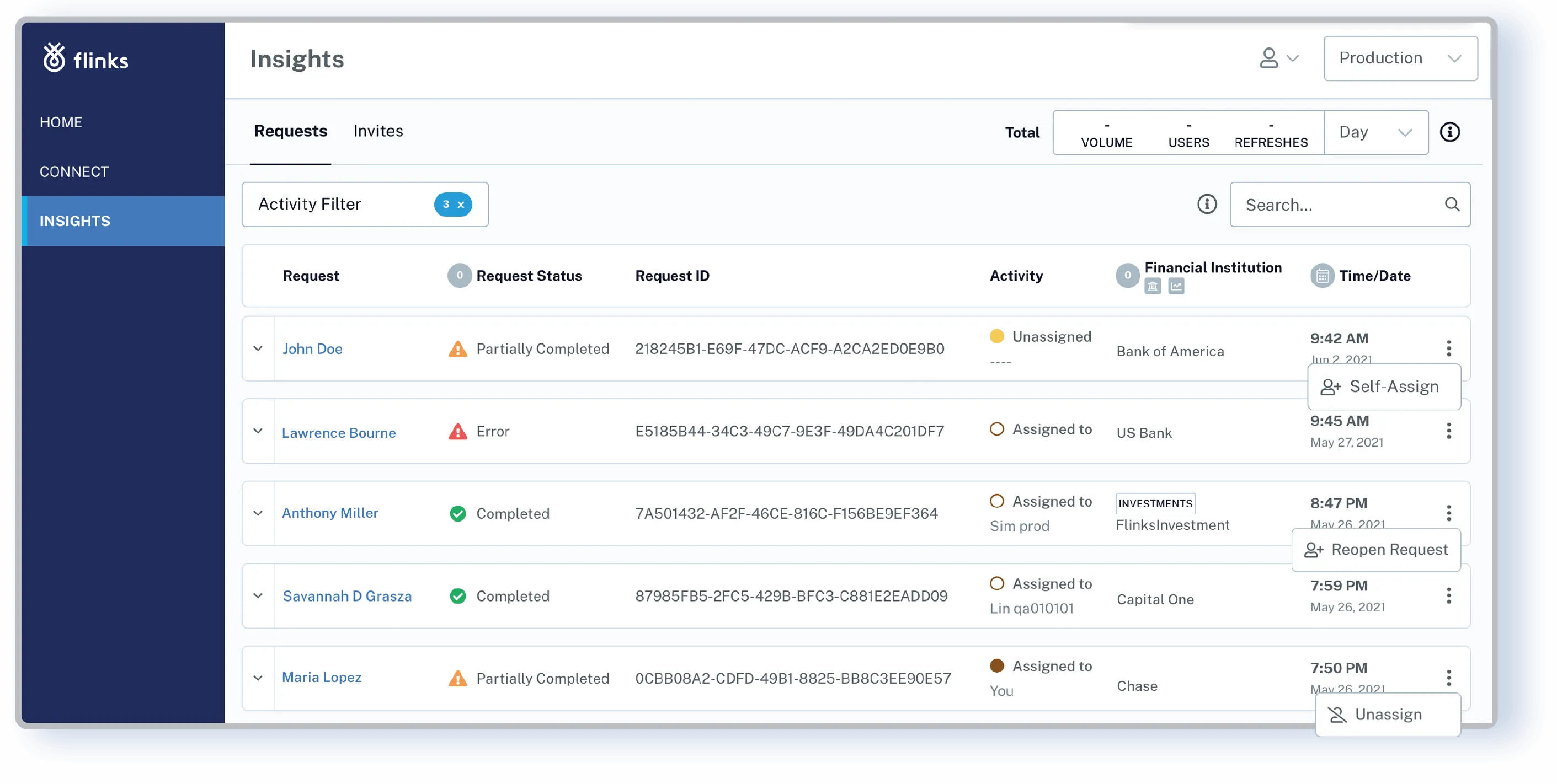 Dealing with client requests using disjointed tools and siloed systems can hinder your business growth. Flinks’ assign request feature allows you to assign review tasks to specific individuals, promoting better visibility and collaboration among team members. It is one of the simplest ways to sort, visualize, and manage your workflow by processing stage and/or by the assigned agent.