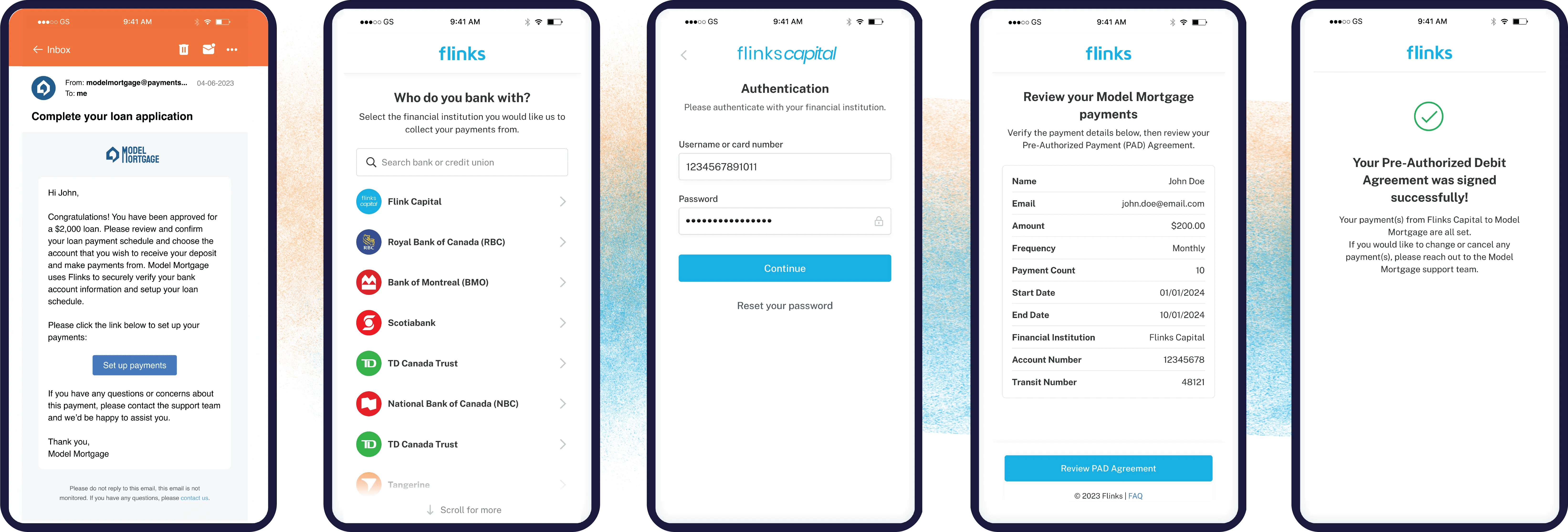 Flinks Pay provides a single workflow experience that enables easy validation, authorization and payment setup for funding and repayment, including repayment scheduling, with just a few clicks. Moreover, Flinks validates account information against details from a given bank connection – this helps minimize EFT payment risk and potential fraud.
