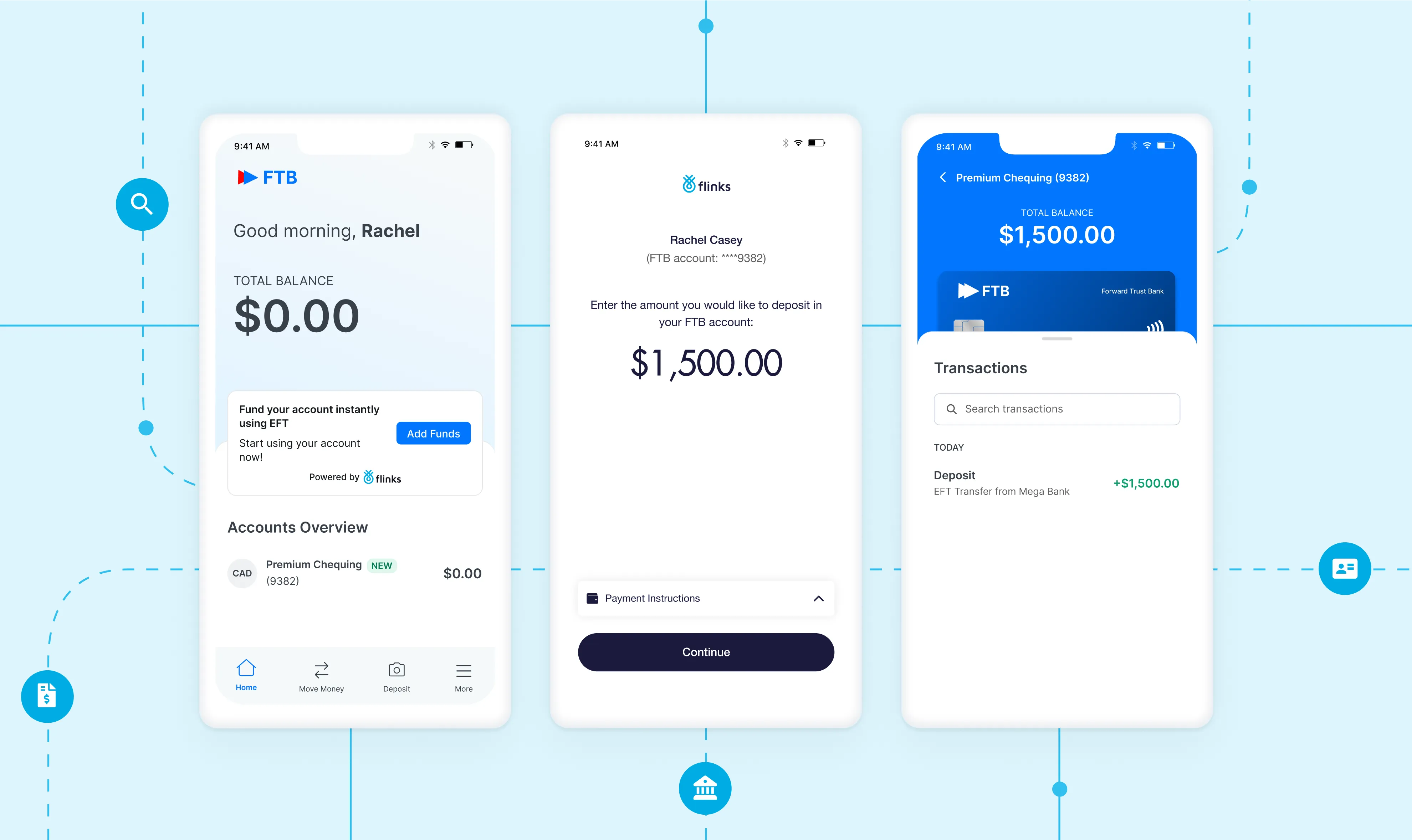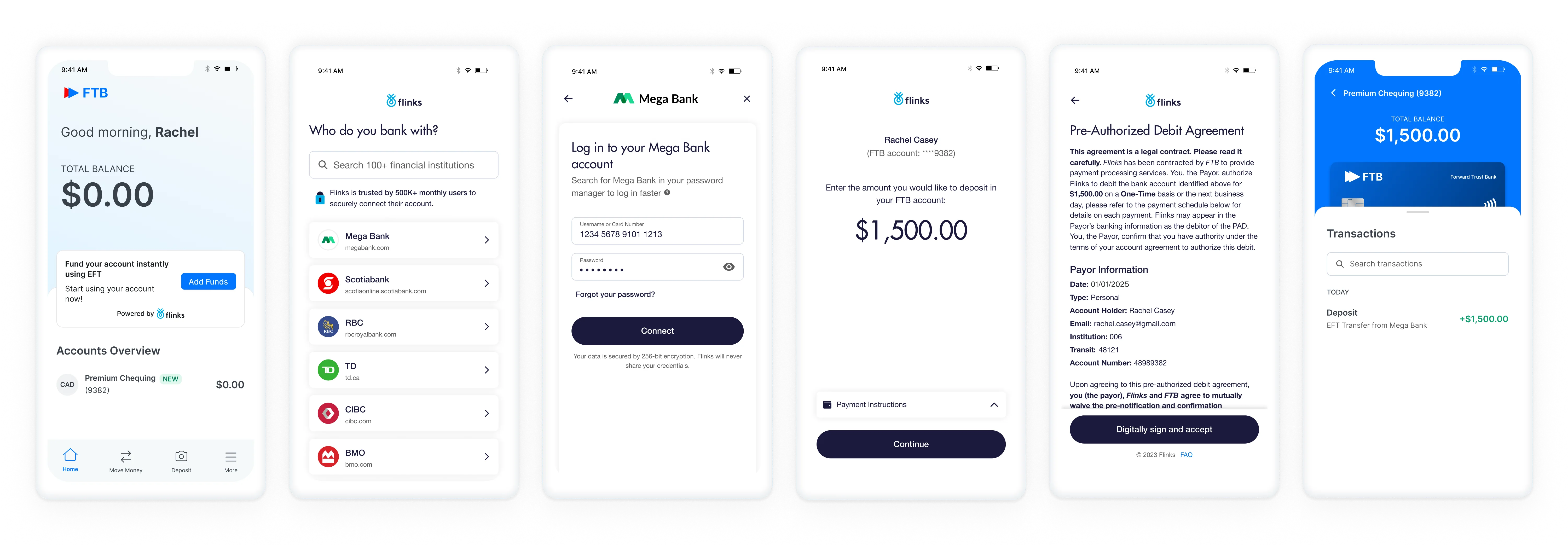 - Same-day fund availability: Verified transactions are guaranteed by Flinks and processed within the same day, enabling financial institutions to provide near-instant access to funds to their customers