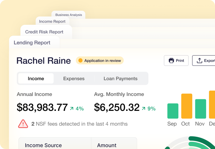 4,500+ enriched attributes deliver a complete financial picture — covering transactions, income, cash flow trends, liabilities, NSF events, overdrafts, loan stacking, and more.