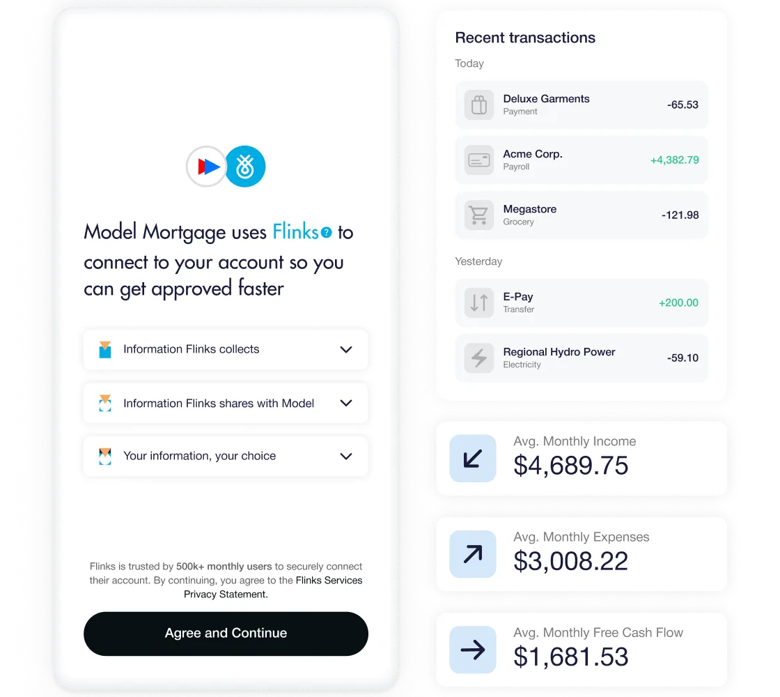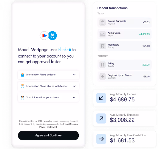 Access up to 12 months of transactions and turn raw data into clear cash-flow insights for individuals and businesses. Use enriched categorization to enhance your credit decisioning with insights you can access via dashboard, API, or webhooks.