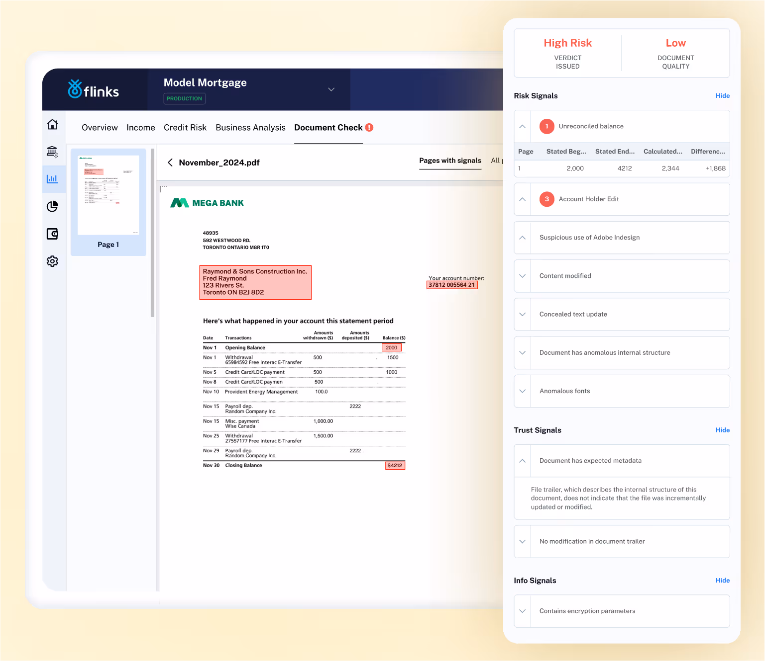 Adapt Flinks to your unique underwriting processes–set custom workflows and risk thresholds based on document type, source, and detected anomalies.